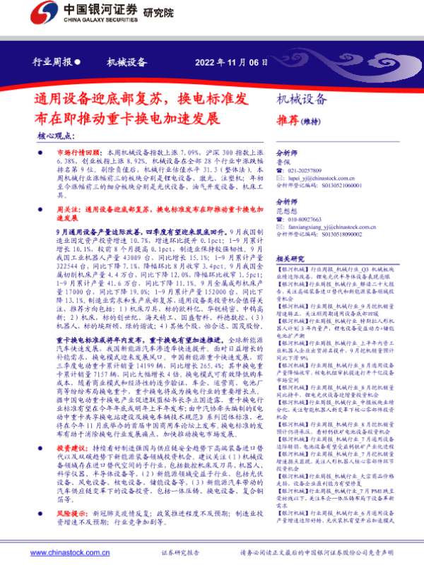 【银河证券】【20221106】20221106-中国银河-机械设备行业周报:通用设备迎底部复苏,换电标准发布在即推动重卡换电加速发展-21页 行业研究