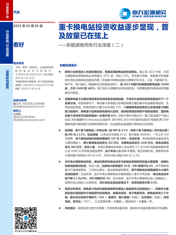 【申万宏源】【20230303】新能源商用车行业深度(二):重卡换电站投资收益逐步显现,普及放量已在弦上-24页 行业研究