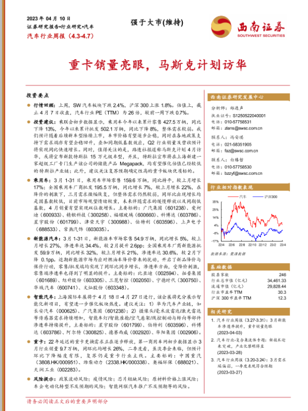 【西南证券】【20230410】20230410-西南证券-汽车行业周报:重卡销量亮眼,马斯克计划访华-17页 行业研究