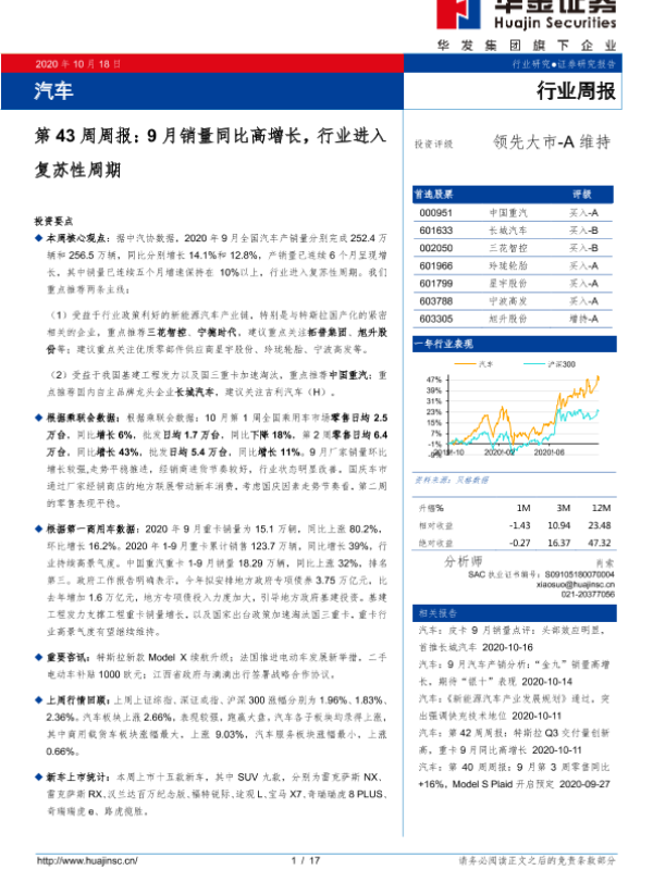 【华金证券】【20201018】汽车第43周周报:9月销量同比高增长,行业进入复苏性周期-17页 行业研究