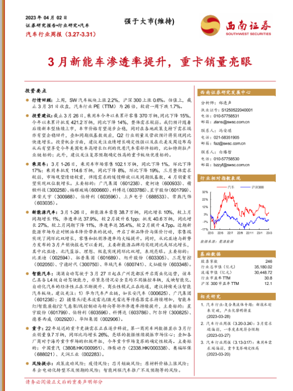 【西南证券】【20230402】20230402-西南证券-汽车行业周报:3月新能车渗透率提升,重卡销量亮眼-16页 行业研究