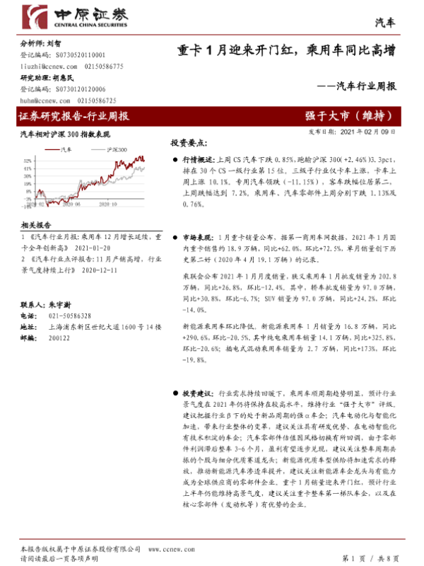 【中原证券】【20210209】汽车行业周报:重卡1月迎来开门红,乘用车同比高增-8页 行业研究