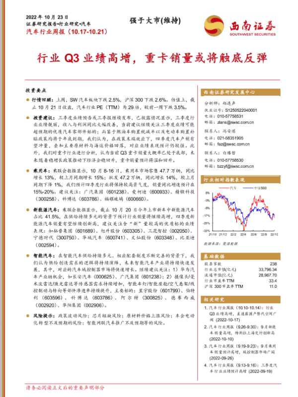 【西南证券】【20221023】汽车行业周报:行业Q3业绩高增,重卡销量或将触底反弹-19页 行业研究