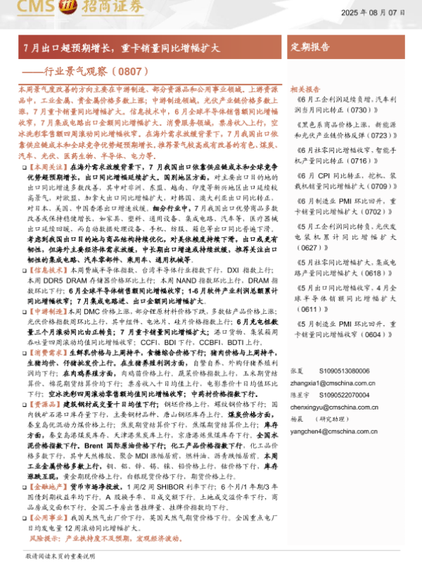 【海通证券】【202508】行业景气观察:7月出口超预期增长,重卡销量同比增幅扩大-32页 证券期货研究报告
