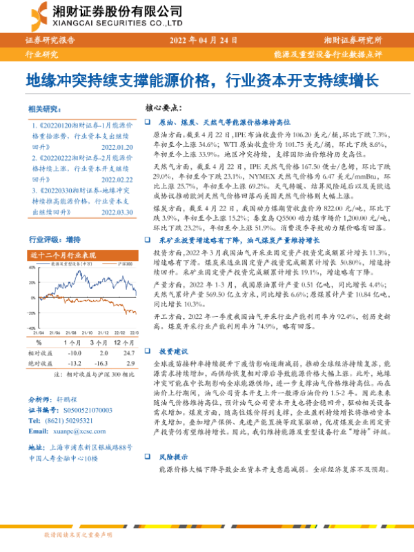 【湘财证券】【20220424】能源及重型设备行业数据点评:地缘冲突持续支撑能源价格,行业资本开支持续增长-8页 行业研究