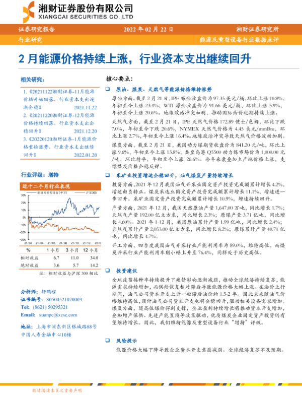 【湘财证券】【20220222】2月能源价格持续上涨,行业资本支出继续回升-8页 行业研究