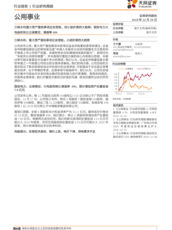 【天风证券】【20191229】公用事业行业研究周报:三峡水利重大资产重组事项过会受阻,但小波折难挡大趋势;国投电力火电股权转让尘埃落定,增值率49%-8页 行业研究