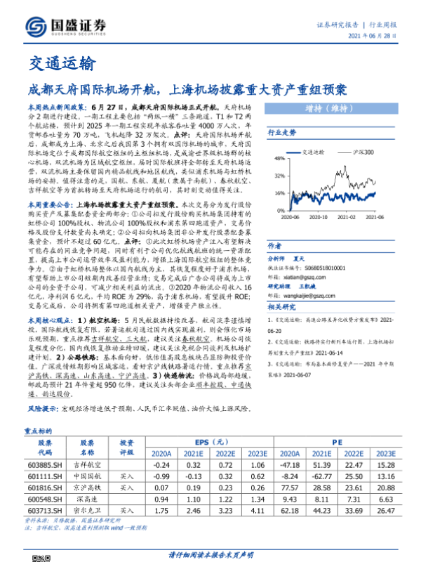 【国盛证券】【20210628】交通运输行业周报:成都天府国际机场开航,上海机场披露重大资产重组预案-16页 行业研究