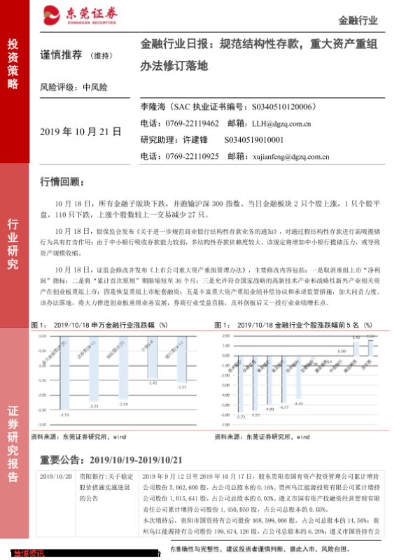 【东莞证券】【20191021】金融行业日报:规范结构性存款,重大资产重组办法修订落地-6页 行业研究