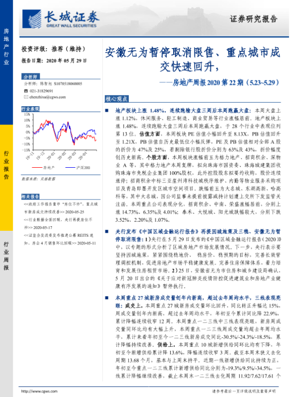【长城证券】【20200529】安徽无为暂停取消限售、重点城市成交快速回升-15页 行业研究