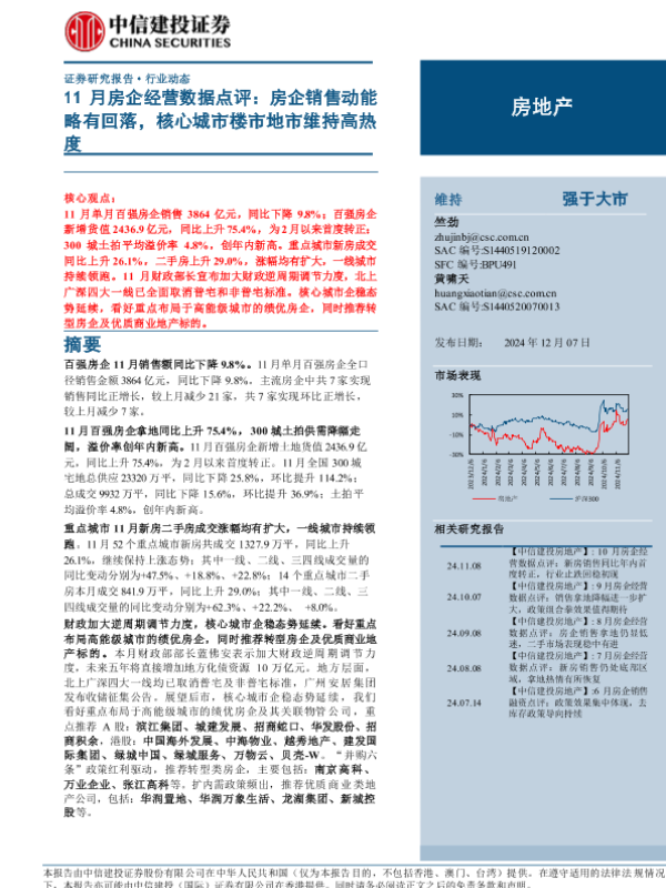 【中信建投证券】【20241207】房地产行业11月房企经营数据点评:房企销售动能略有回落,核心城市楼市地市维持高热度-14页 行业研究