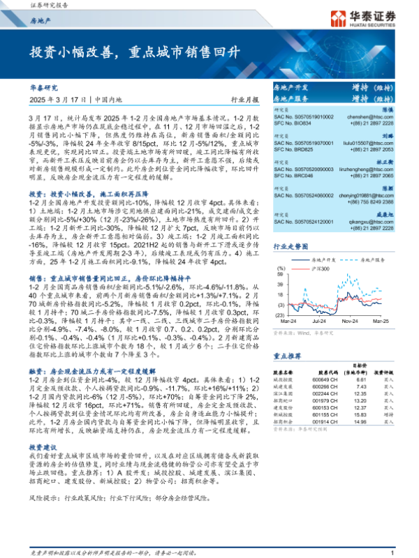 【华泰证券】【20250317】20250317-华泰证券-房地产行业月报:投资小幅改善,重点城市销售回升-16页 行业研究