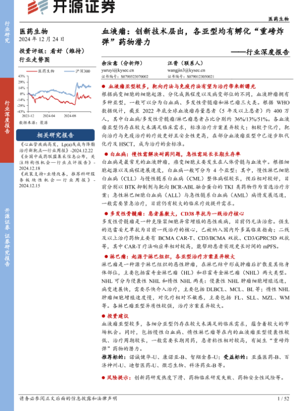 【开源证券】【20241224】医药生物行业深度报告-血液瘤:创新技术层出,各亚型均有孵化“重磅炸弹”药物潜力-52页 行业研究