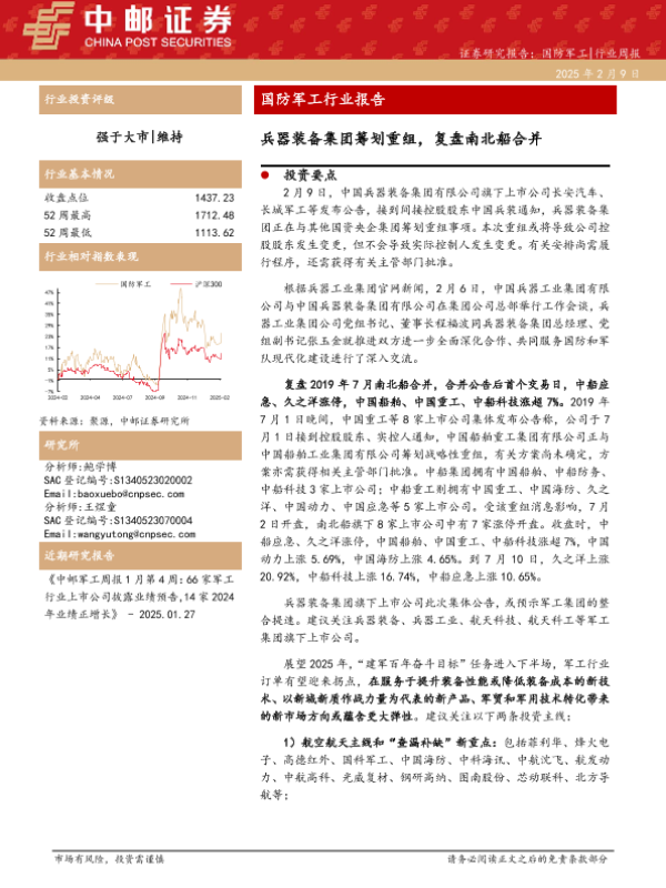 【中邮证券】【20250209】国防军工行业报告:兵器装备集团筹划重组,复盘南北船合并-14页 行业研究