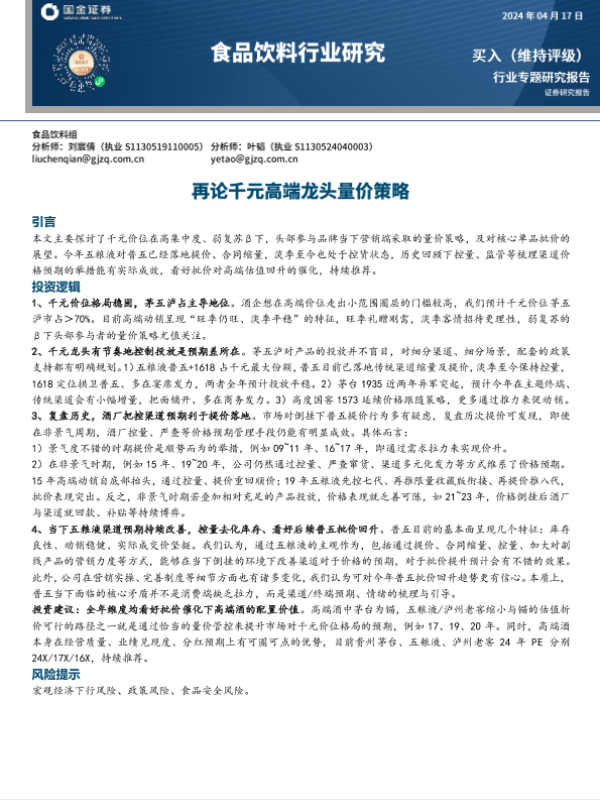 【国金证券】【20240417】食品饮料行业专题研究报告:再论千元高端龙头量价策略-19页 行业研究