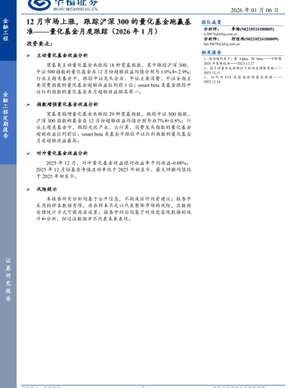 【华福证券】【202512】金融工程定期报告 金融工程定期报告 12月市场上涨,跟踪沪深 300的量化基金跑赢基准——量化基金月度跟踪(2026年 1月)-13页 证券期货研究报告