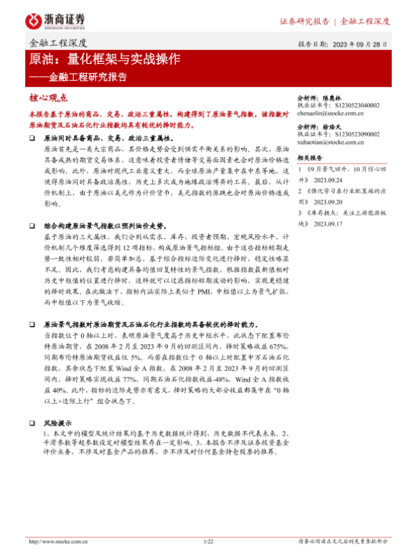 【浙商证券】【20230928】金融工程研究报告:原油,量化框架与实战操作-22页 行业研究