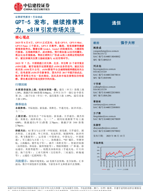 【中信建投证券】【202508】通信行业:GPT-5发布,继续推荐算力,eSIM引发市场关注-10页 证券期货研究报告