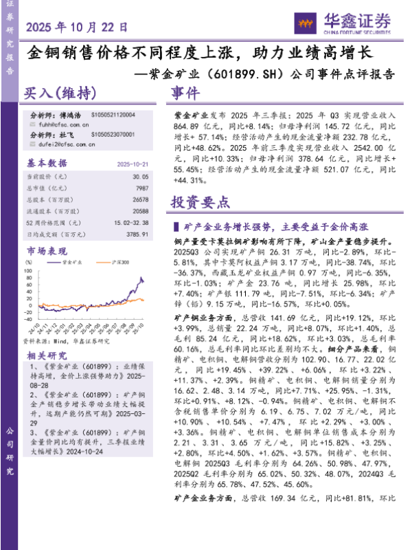 【华鑫证券】【202510】金铜销售价格不同程度上涨,助力业绩高增长-5页 证券期货研究报告