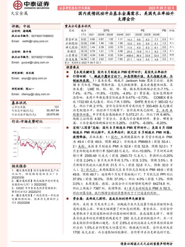 【中泰证券】【20220902】20220902-中泰证券-大宗金属行业周报:国内疫情扰动冲击基本金属需求,美国失业率抬升支撑金价-29页 行业研究