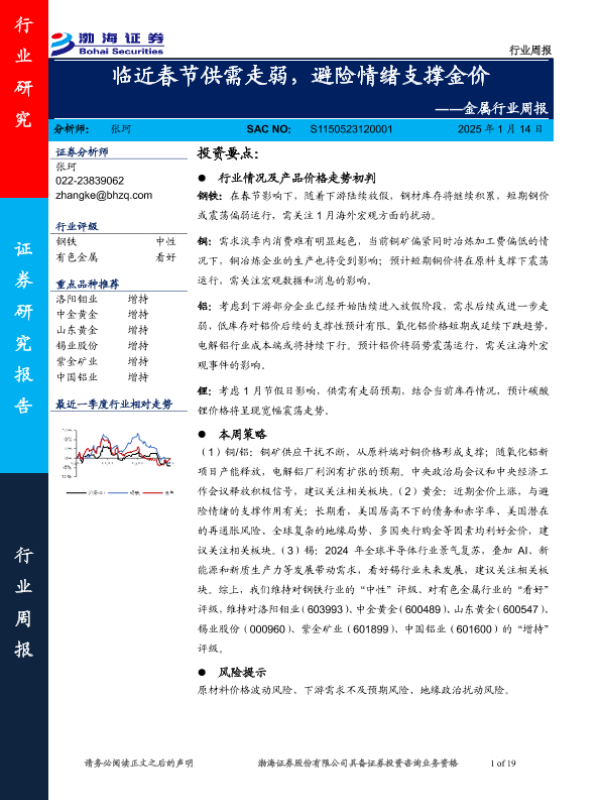【渤海证券】【20250114】20250114-渤海证券-金属行业周报:临近春节供需走弱,避险情绪支撑金价-19页 行业研究