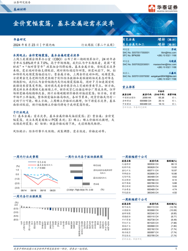 【华泰证券】【20240623】20240623-华泰证券-基础材料行业周报(第二十五周):金价宽幅震荡,基本金属迎需求淡季-16页 行业研究