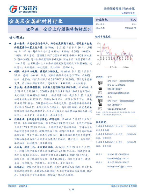 【广发证券】【20230527】20230527-广发证券-金属及金属新材料行业投资策略周报:锂价涨,金价上行预期将持续提升-25页 行业研究