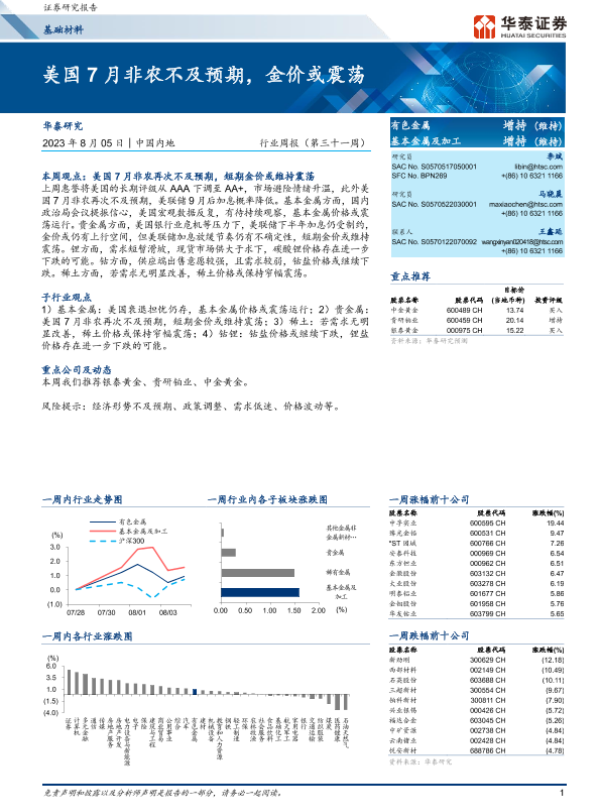 【华泰证券】【20230805】20230805-华泰证券-基础材料行业周报(第三十一周):美国7月非农不及预期,金价或震荡-16页 行业研究
