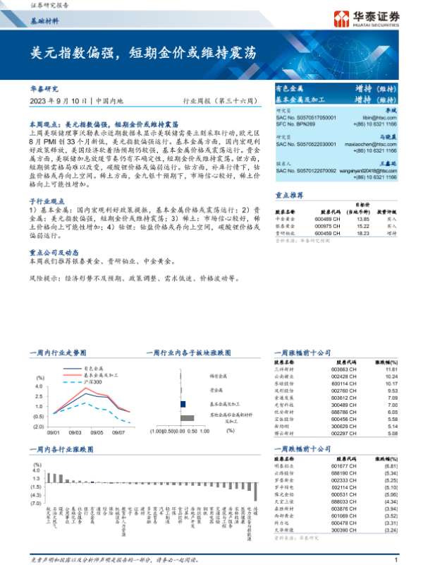 【华泰证券】【20230910】20230910-华泰证券-基础材料行业周报(第三十六周):美元指数偏强,短期金价或维持震荡-15页 行业研究