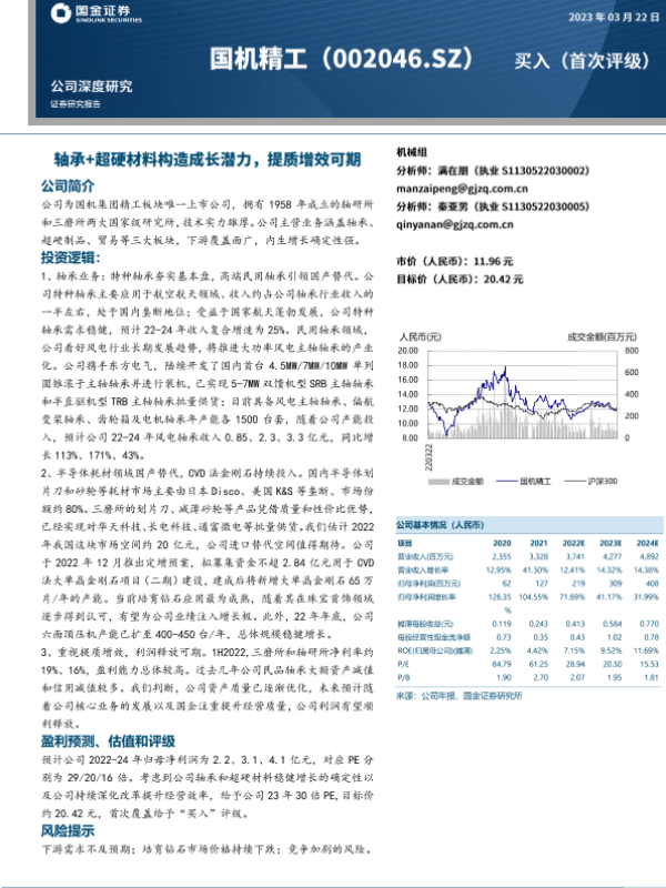【国金证券】【20230322】国机精工-002046.SZ-轴承+超硬材料构造成长潜力,提质增效可期-21页 行业研究