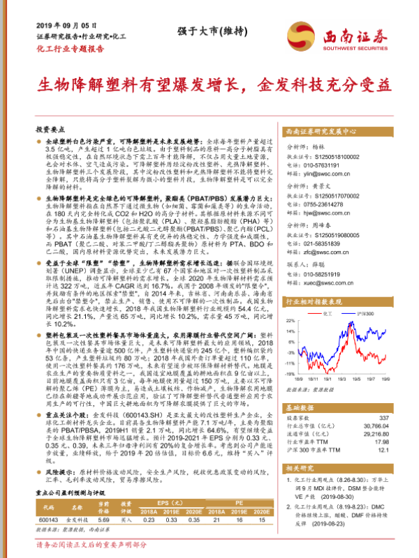 【西南证券】【20190905】化工行业专题报告:生物降解塑料有望爆发增长,金发科技充分受益-24页 行业研究