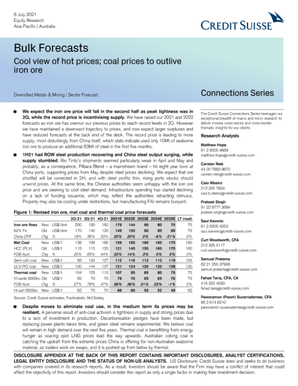 【瑞信(Credit Suisse)】【20210708】瑞信-亚太地区金属与采矿业之澳大利亚-冷观热价:煤炭价格将超过铁矿石价格-44页 行业研究