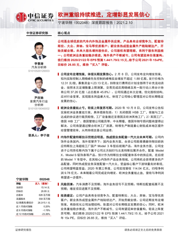 【中信证券】【20210210】20210210-中信证券-宁波华翔-002048.SZ-深度跟踪报告:欧洲重组持续推进,定增彰显发展信心-9页 行业研究