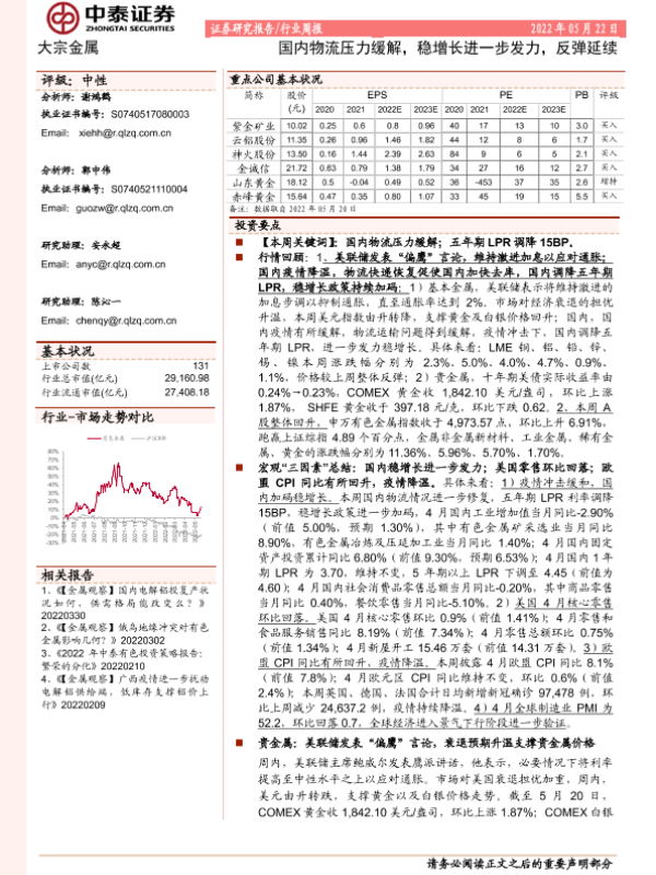【中泰证券】【20220522】20220522-中泰证券-大宗金属行业周报:国内物流压力缓解,稳增长进一步发力,反弹延续-25页 行业研究