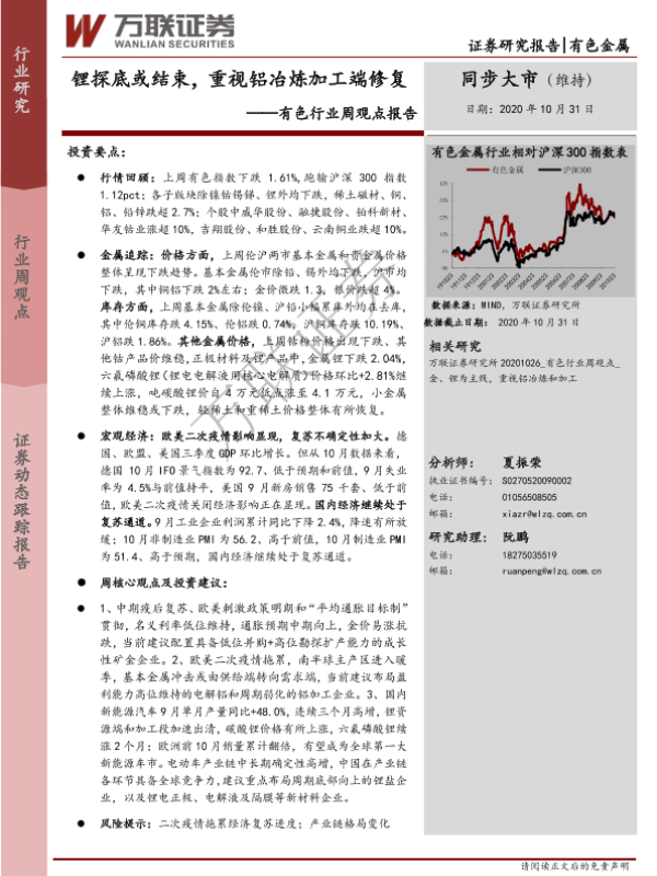 【万联证券】【20201031】20201031-万联证券-有色行业周观点报告:锂探底或结束,重视铝冶炼加工端修复-11页 行业研究