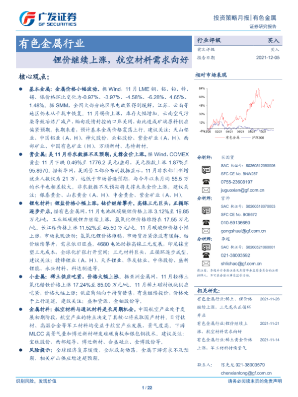 【广发证券】【20211205】20211205-广发证券-有色金属行业投资策略月报:锂价继续上涨,航空材料需求向好-22页 行业研究