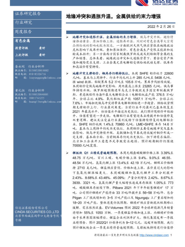 【信达证券】【20220226】地缘冲突和通胀升温,金属供给约束力增强-11页 行业研究