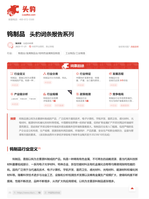 【头豹研究院】【20231121】20240131-头豹研究院-钨制品 头豹词条报告系列-20页 行业研究