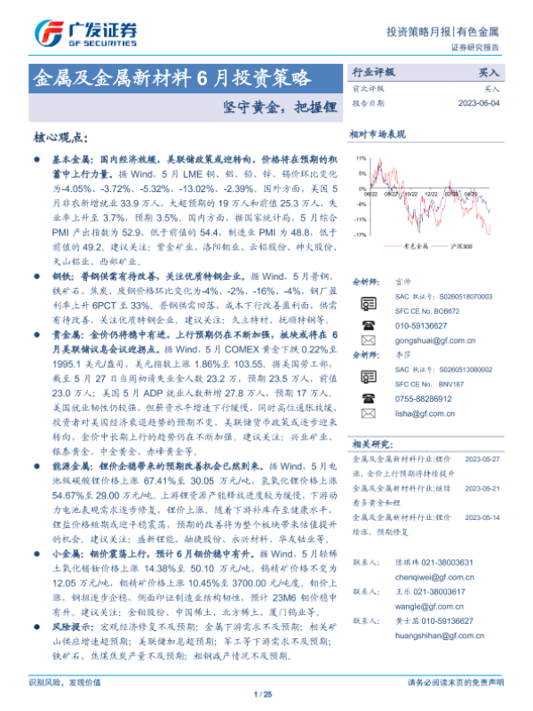 【广发证券】【20230604】金属及金属新材料6月投资策略:坚守黄金,把握锂-25页 行业研究
