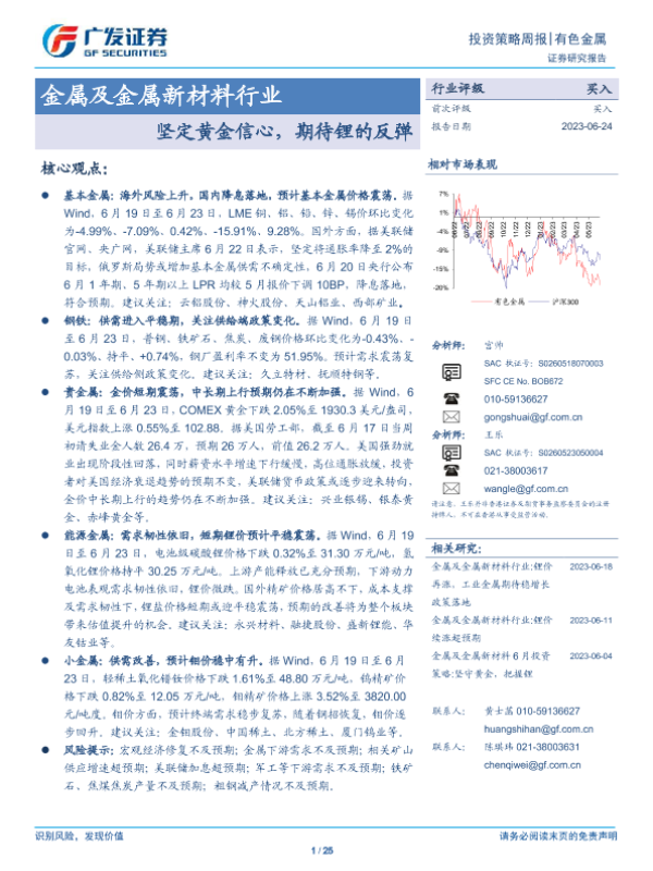 【广发证券】【20230624】金属及金属新材料行业:坚定黄金信心,期待锂的反弹-25页 行业研究
