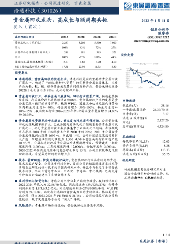【东吴证券(香港)】【20230111】浩通科技-301026.SZ-贵金属回收龙头,高成长与顺周期共振-6页 行业研究