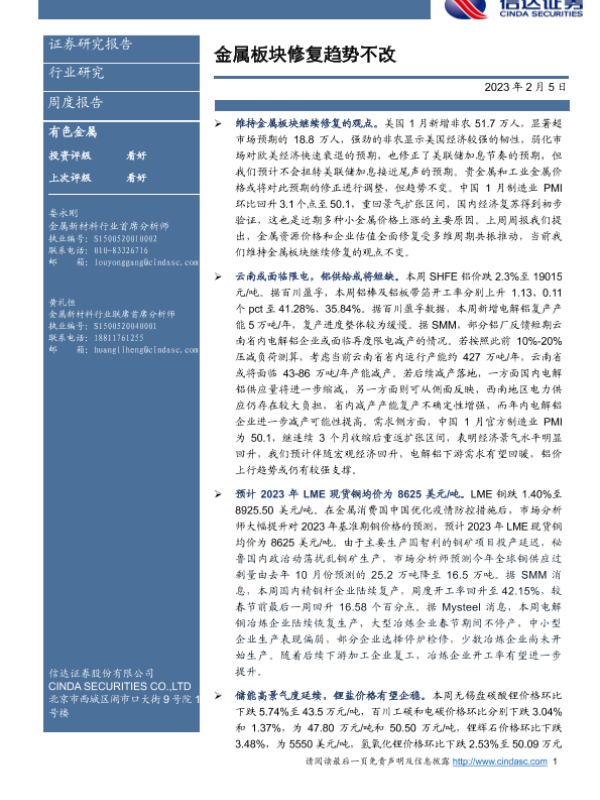【信达证券】【20230205】20230205-信达证券-有色金属周度报告:金属板块修复趋势不改-12页 行业研究