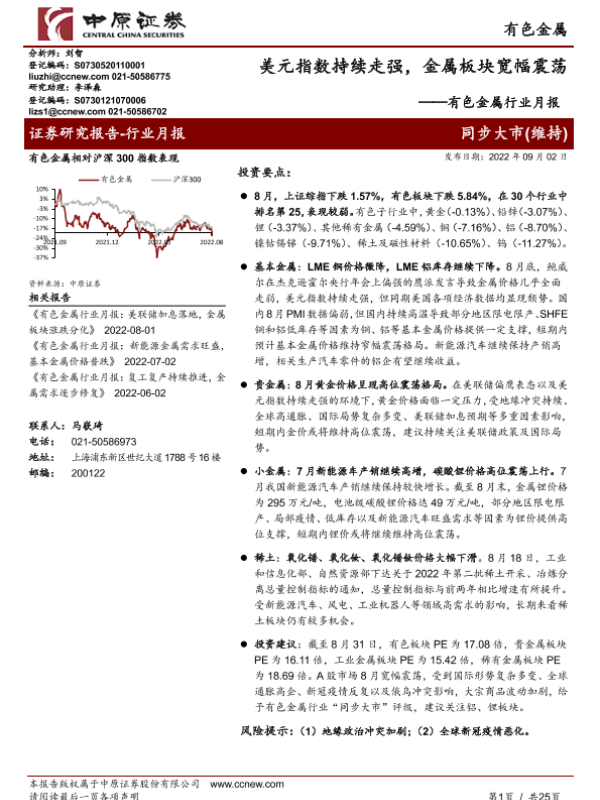 【中原证券】【20220902】有色金属行业月报:美元指数持续走强,金属板块宽幅震荡-25页 行业研究