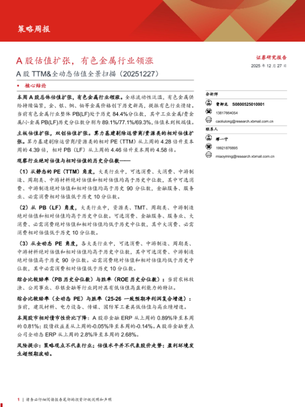 【西部证券】【202512】A股估值扩张,有色金属行业领涨-16页 证券期货研究报告