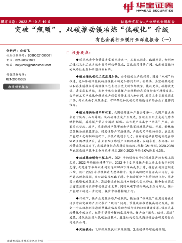 【华宝证券】【20221019】20221019-华宝证券-有色金属行业镁行业深度报告(一):突破“瓶颈”,双碳推动镁冶炼“低碳化”升级-20页 行业研究
