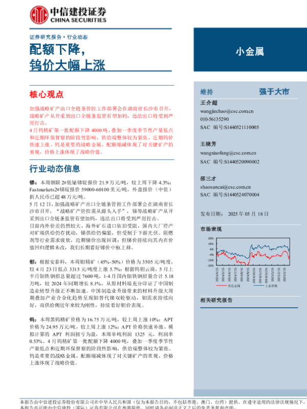 【中信建投证券】【20250518】小金属行业动态:配额下降,钨价大幅上涨-10页 证券期货研究报告
