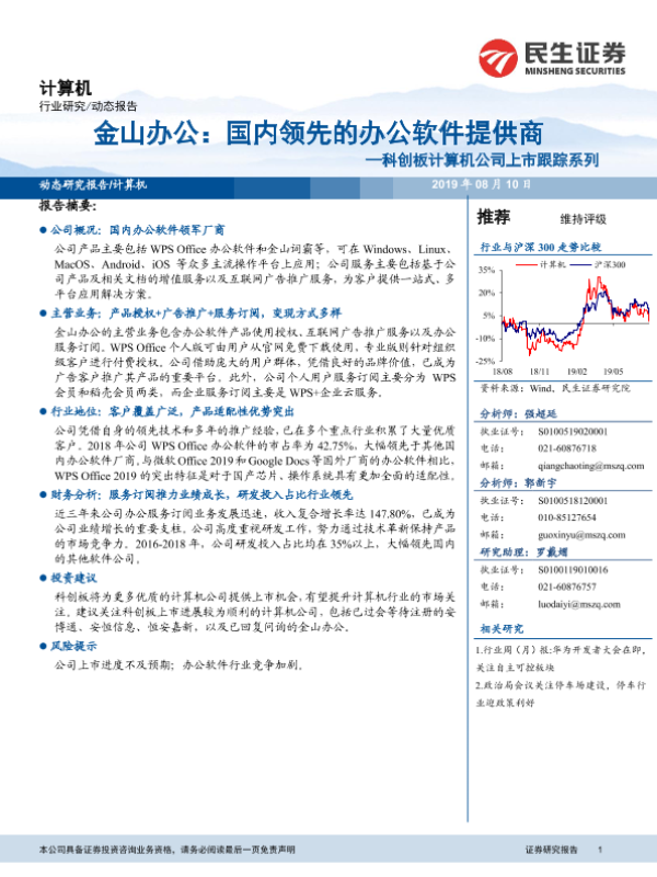 【民生证券】【20190810】金山办公:国内领先的办公软件提供商——科创板计算机公司上市跟踪系列-14页 行业研究