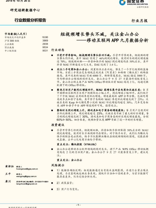 【国金证券】【20191020】移动互联网APP九月数据分析:短视频增长势头不减,关注金山办公-15页 行业研究