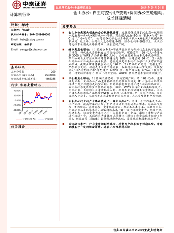 【中泰证券】【20190924】计算机行业专题研究报告:金山办公:自主可控+用户变现+协同办公三轮驱动,成长路径清晰-32页 行业研究