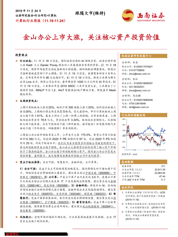 【西南证券】【20191124】20191124-西南证券-计算机行业周报:金山办公上市大涨,关注核心资产投资价值-16页 行业研究